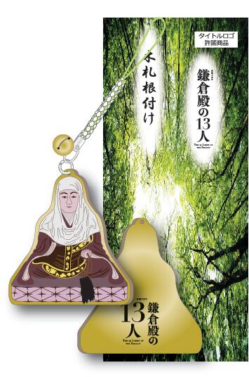 木札素材+根付(鈴付き) /加工:レーザーカット+UV印刷/台紙サイズ:135㎜×55㎜/「鎌倉殿の13人」タイトルロゴ(番組題字)&<北条政子>描き起こしイラスト使用/ /台紙+OPP包装